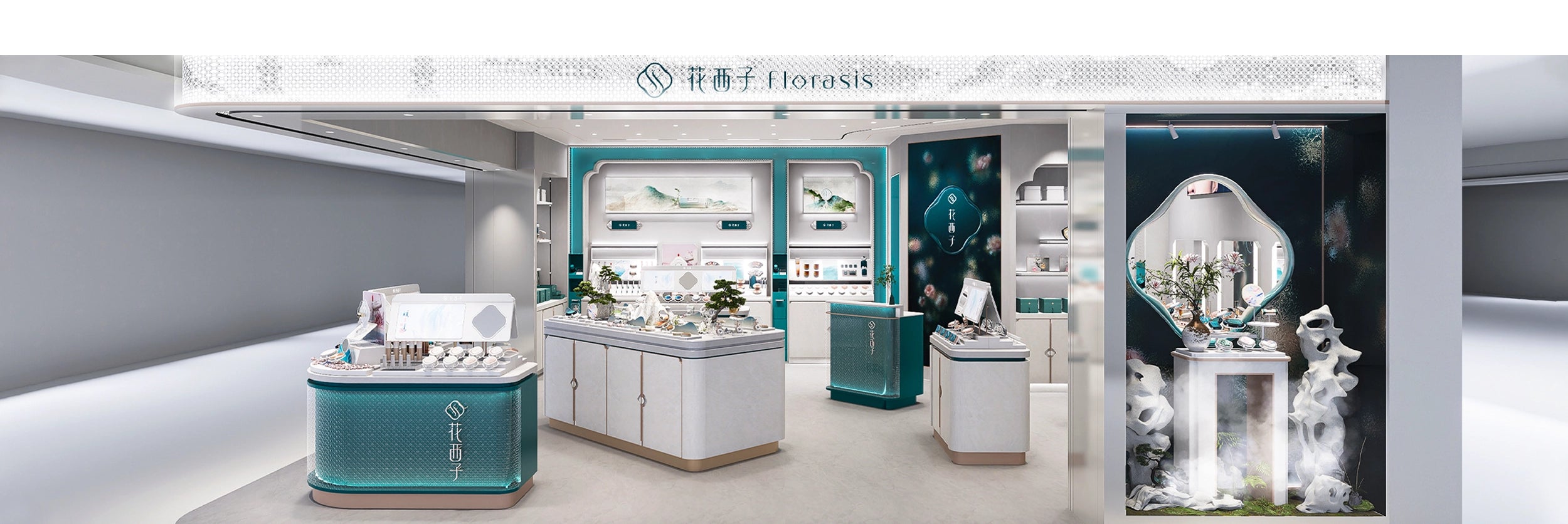 花西子GINZA SIX店のコンセプトは、中国の伝統的な庭園文化「隠園(いんえん)」に由来し、喧騒から離れた静かな場所を意味します。銀座のエレガントなエリアに位置し、自然と調和した静謐な空間を提供し、訪れたお客様に心安らぐひとときをお届けすることを目指しています。